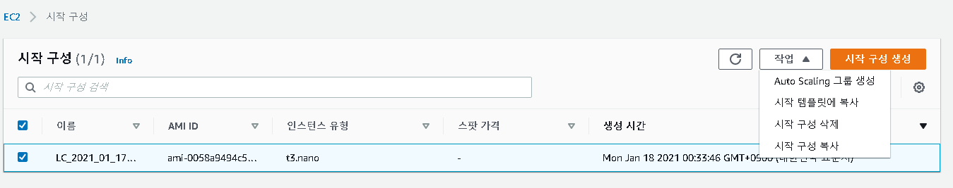 저번 시간에 만든 시작 구성 LC를 체크한 후 작업 탭을 열고 Auto Scaling 그룹 생성을 눌러주세요.
