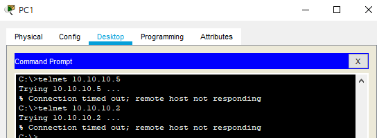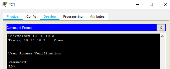 이렇게 ACL을 만들었다면 PC1에서 R0에 telnet 접속을 해봅시다.