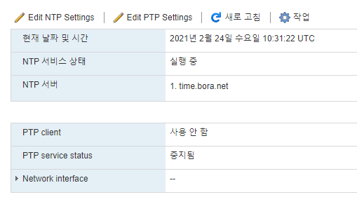 여기서 이 호스트에서 날짜 및 시간 수동 구성으로 되어있는데 네트워크 시간 프로로콜 사용을 선택 후