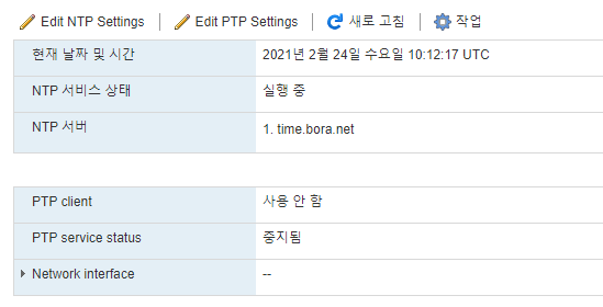 여기서 이 호스트에서 날짜 및 시간 수동 구성으로 되어있는데 네트워크 시간 프로로콜 사용을 선택 후