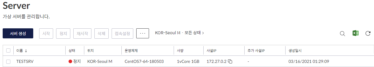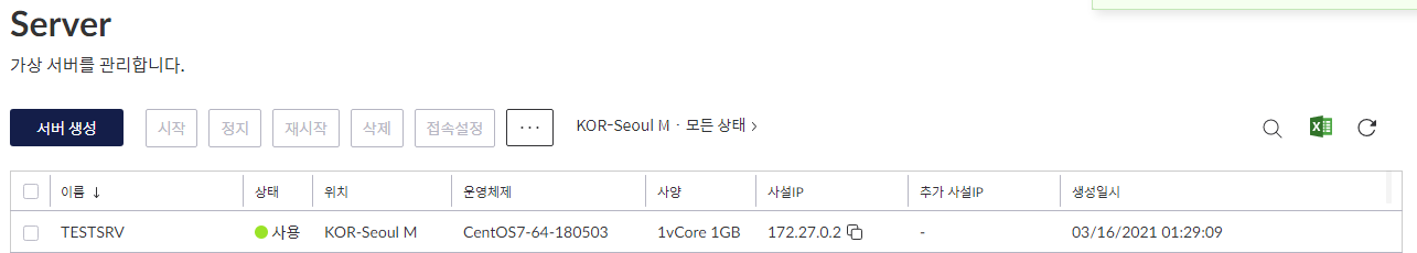 저는 미리 만들어둔 서버가 있어서 리스트에 보입니다. 이 화면에서 서버 생성 버튼을 눌러주세요.