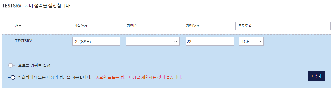 2. SSH연결을 위해 22번 포트를 위 사진과 같이 설정 후 추가를 눌러줍니다. (공인 IP는 보안상 가렸습니다.)