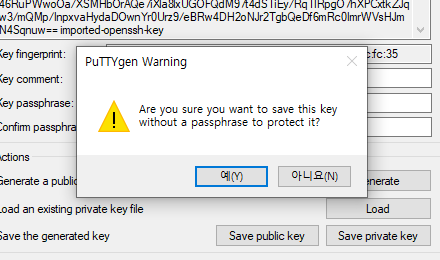 1. puttygen 프로그램 실행 후 pem파일을 불러옵니다. Successfully가 뜨면 성공입니다.