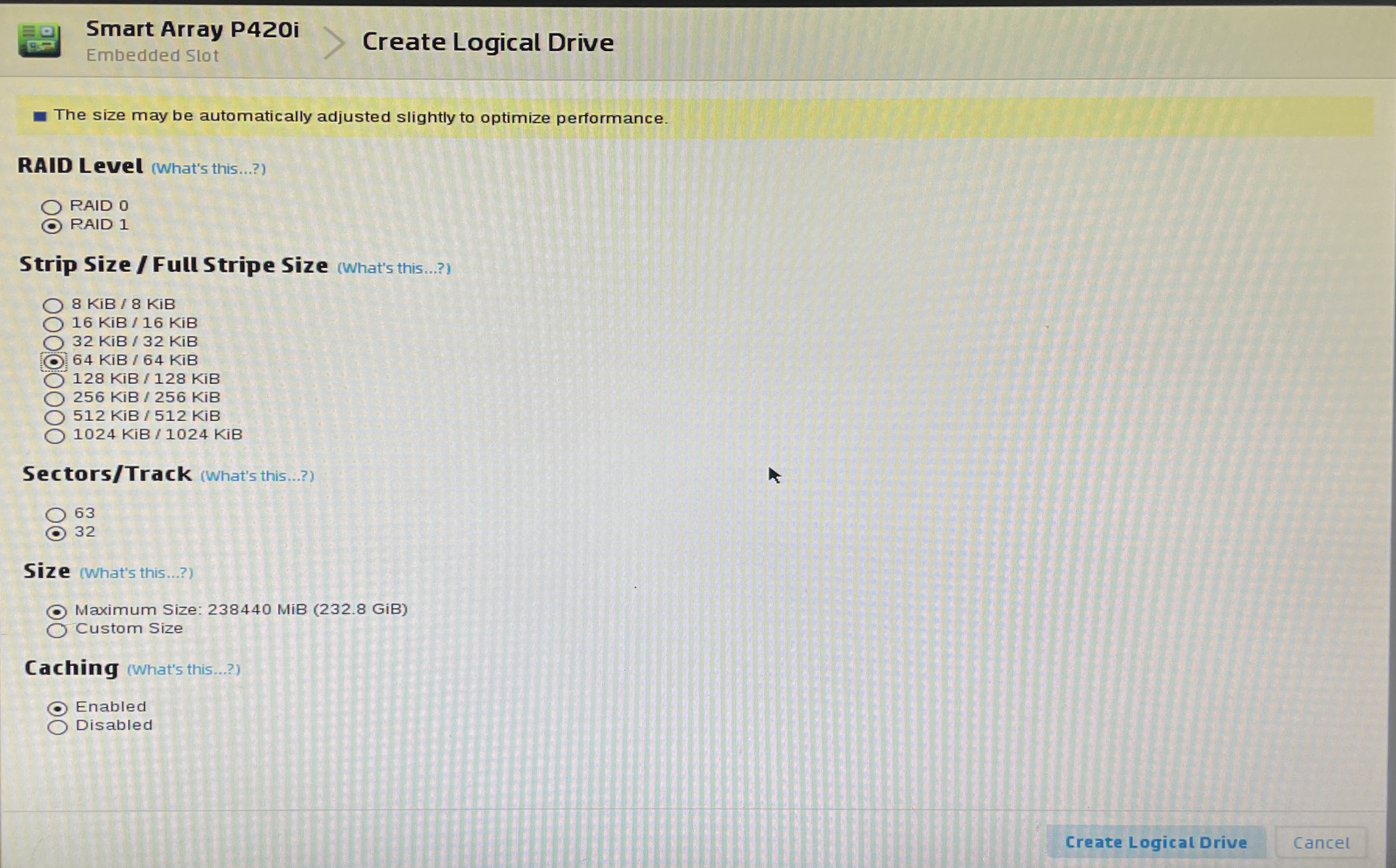 5. RAID 레벨과 그 외 설정을 해주세요. (OS 설치를 위해 RAID 1 선택)