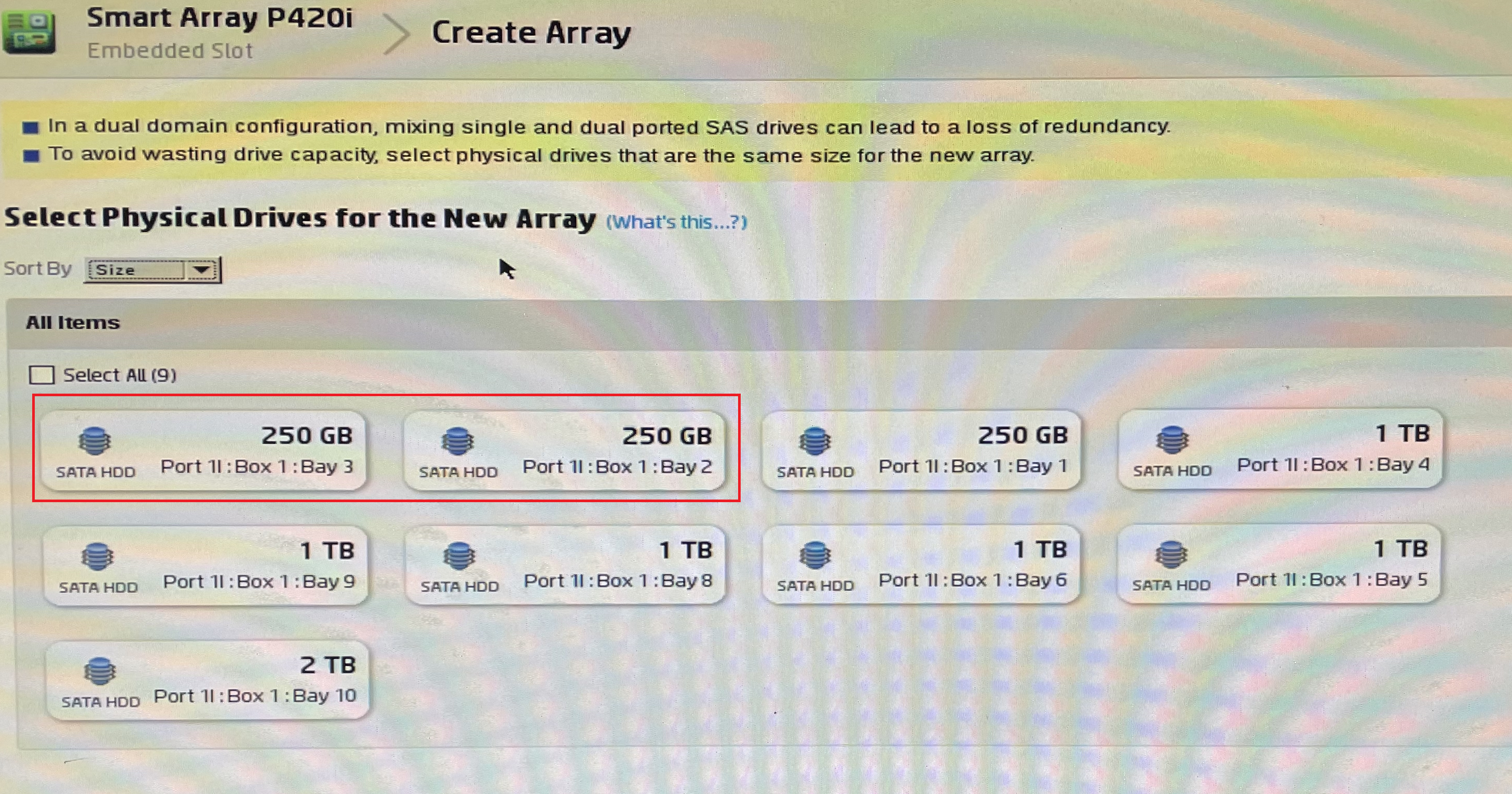 4. 레이드 설정 할 디스크를 선택해주세요. (OS 설치를 위해 디스크 2개를 선택했습니다.)