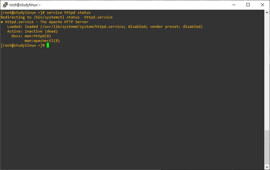 2. 패키지가 설치되었으면 service httpd status 명령어로 설치가 되었는지 확인해봅시다.