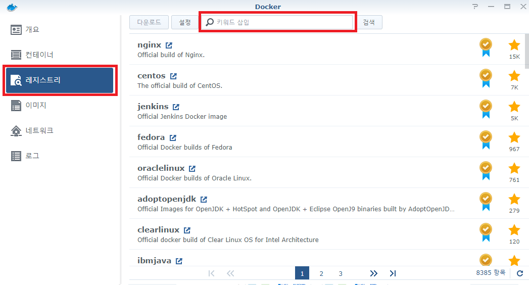 레지스티리 탭에 왔다면 원하는 이미지를 검색 후 다운로드를 해줍니다.