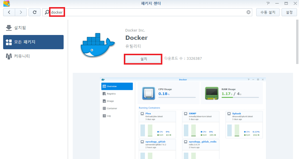 먼저 DSM에 로그인 후 패키지 센터에 가서 docker를 찾아 설치해주세요.