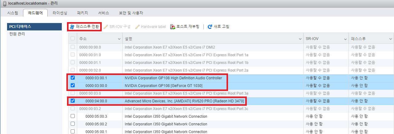 들어가서 이제 패스스루 설정할 그래픽카드를 선택 후 패스스루 전환을 눌러줍니다.