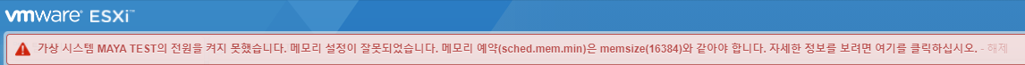 이제 해당 VM를 부팅하면 위와 같은 에러가 발생합니다. 이제 메모리 예약을 해봅시다.