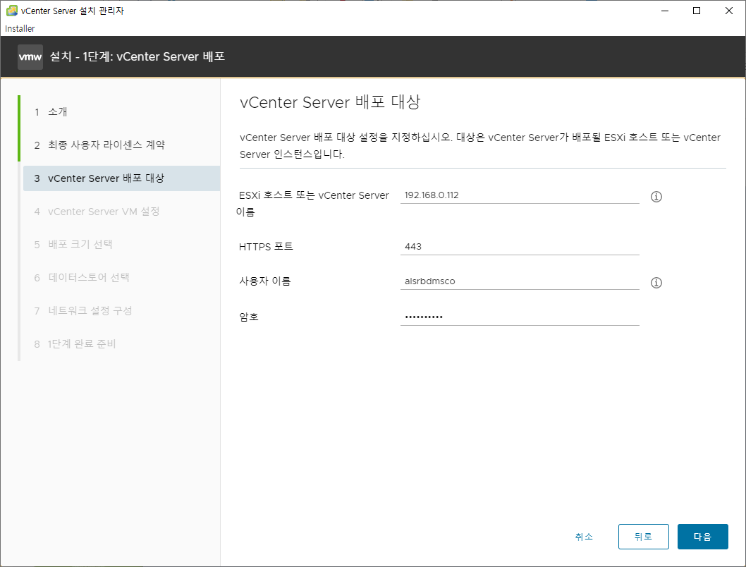 6. 이제 vCenter Server를 배포할 ESXi 대상 정보를 입력해주시면 됩니다.