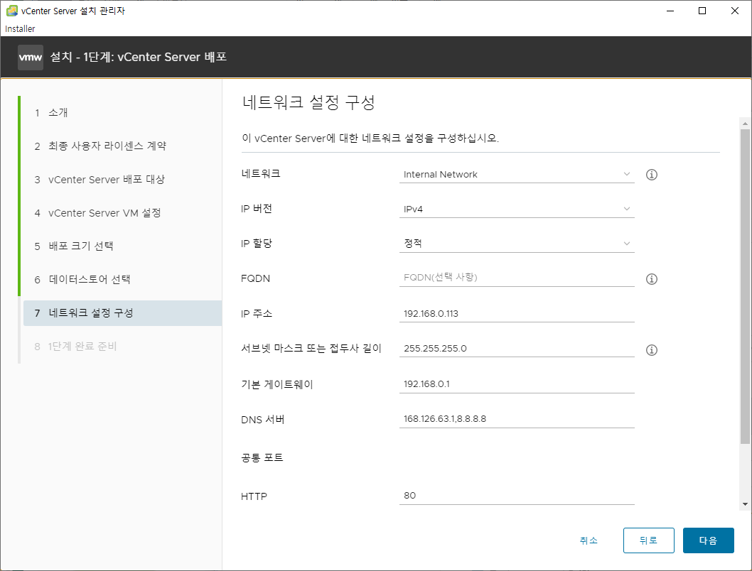 11. 네트워크 설정 구성창이 나오게 됩니다. 저는 위 사진과 같이 구성했습니다. 여기서 IP는 VCSA의 IP입니다.