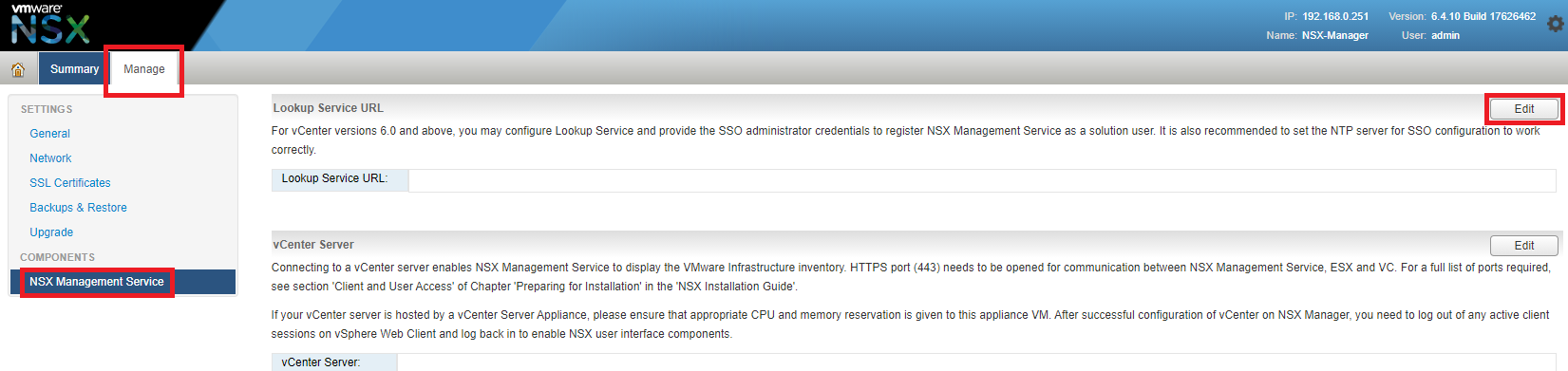 1. NSX 로그인 후 Manage -> NSX Management Service -> Edit을 눌러줍니다.