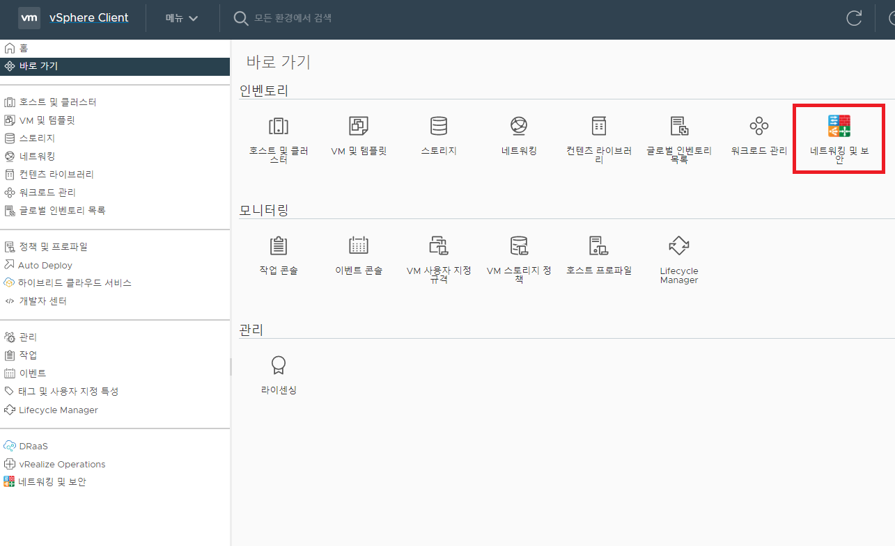 이제 vCenter에 돌아가서 인벤토리 목록에 보게 되면 네트워킹 및 보안이라는 항목이 추가가 된 것을 볼 수 있습니다.