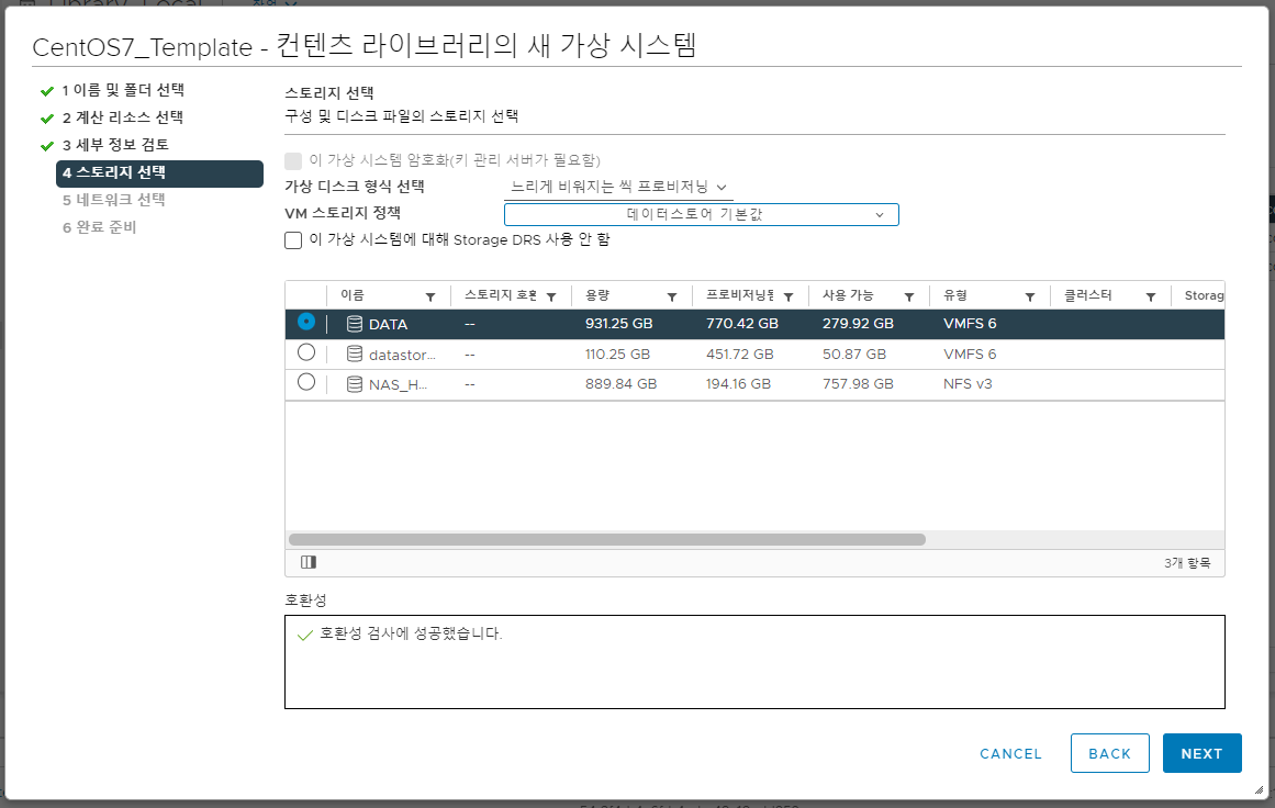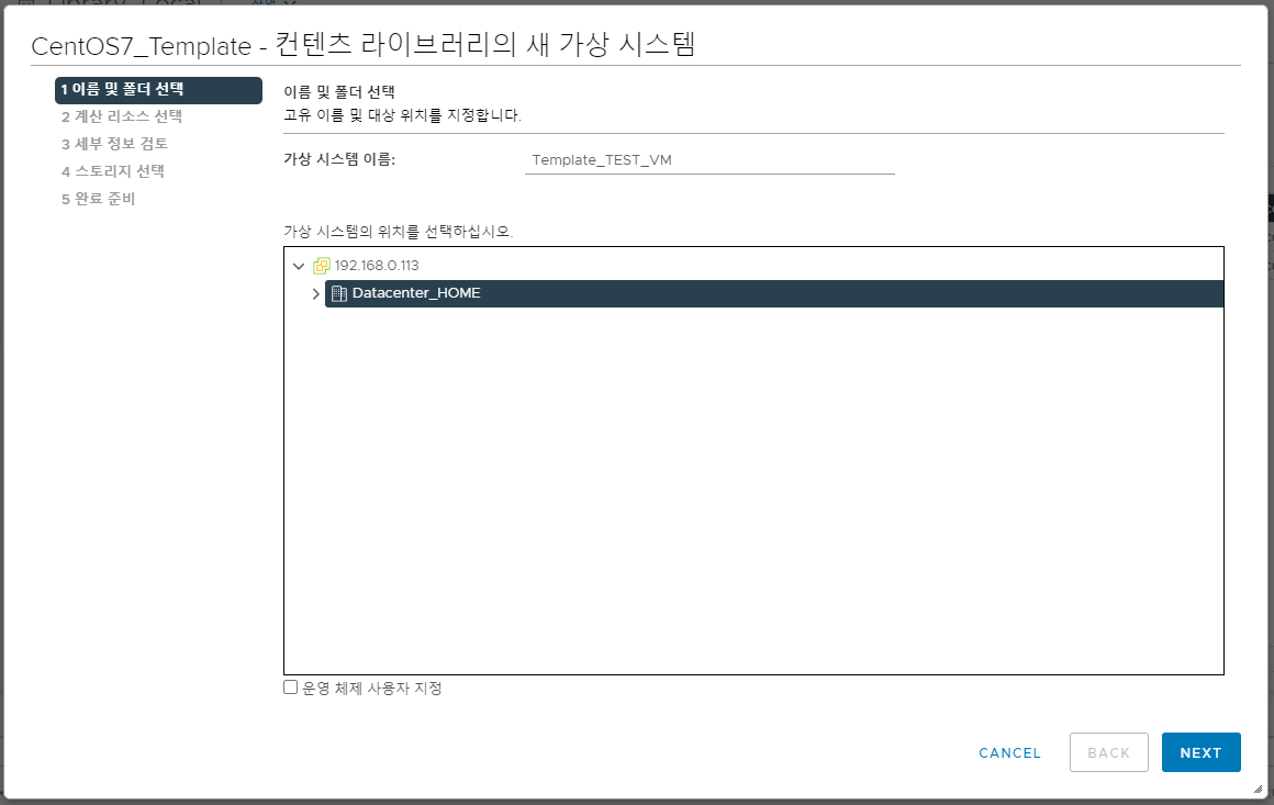 4. 가상 머신이 실행될 호스트 및 클러스터를 선택 후 넘어갑니다.