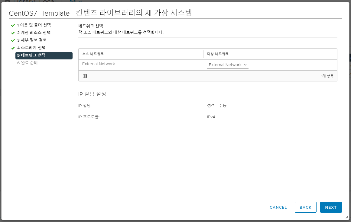 7. VM이 연결될 네트워크를 선택해주시면 됩니다. 저는 경우 외부망에 연결했습니다.