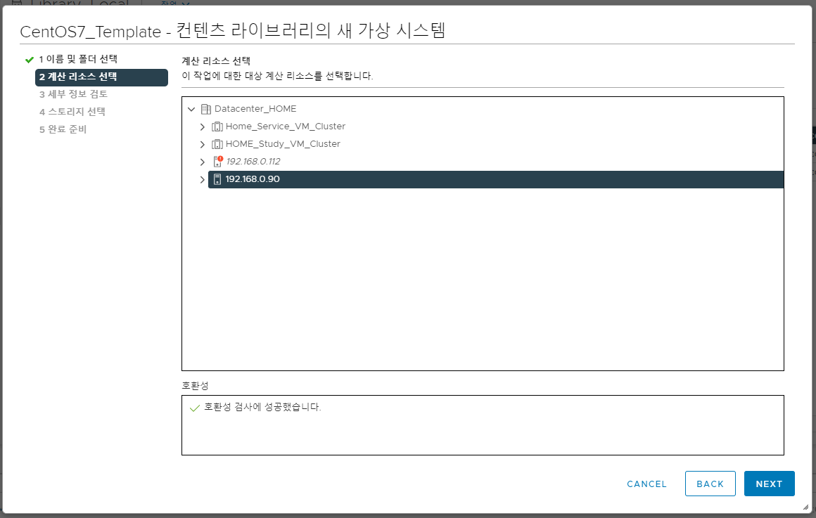 4. 가상 머신이 실행될 호스트 및 클러스터를 선택 후 넘어갑니다.