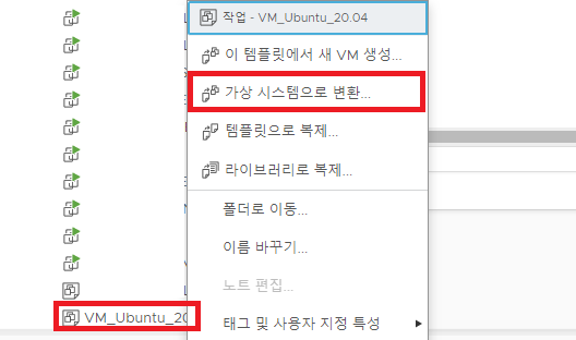 2. 변환할 템플릿을 우클릭 -> 가상 시스템으로 변환을 눌러줍니다.