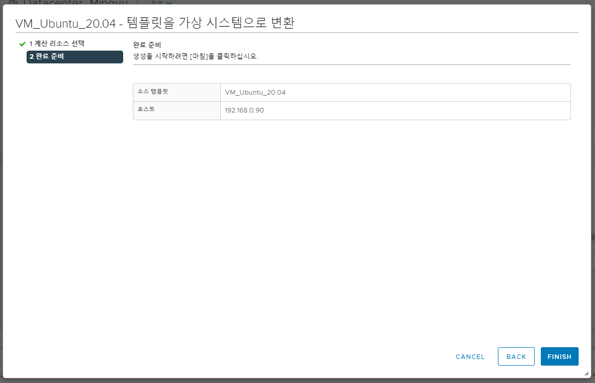 VM을 템플릿으로 변환하는 과정이 있는데 이번에는 반대로 해주시면 됩니다.