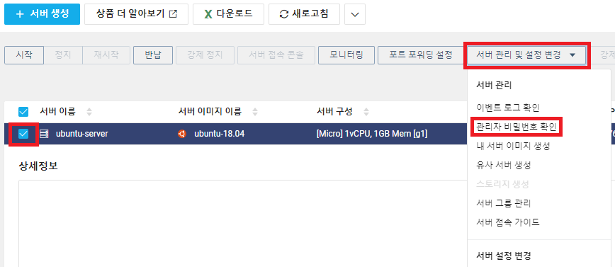 1. 접속할 서버 선택 후 서버 관리 및 설정 변경 -> 관리자 비밀번호 확인