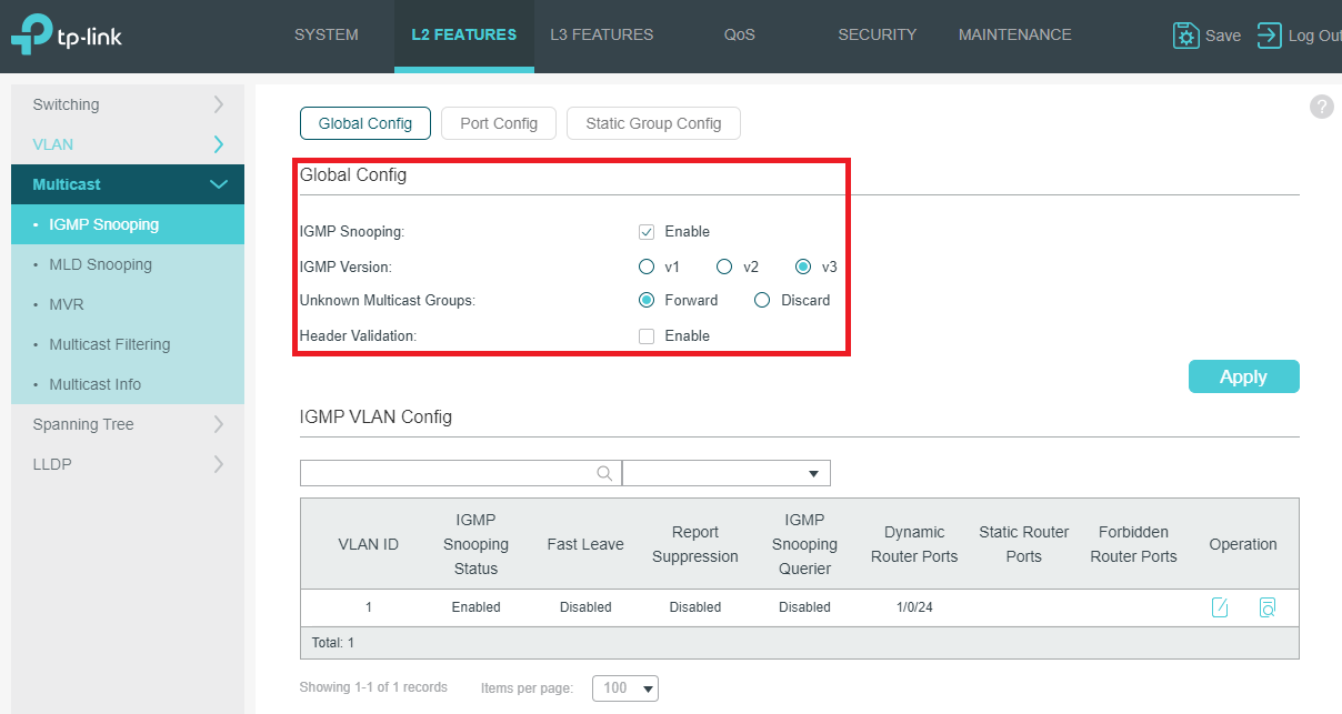 여기서 IGMP Snooping 옵션을 Enable로 변경하고 Version은 v3로 선택 후 Apply을 해줍니다.