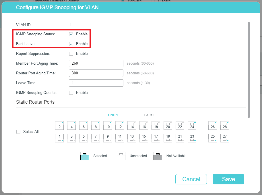 3. IGMP Snooping Status, Fast Leave 옵션을 Enable로 변경해주고 저장을 해줍니다.