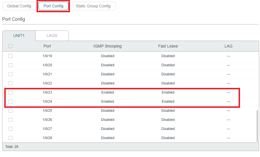 4. 마지막으로 상단에 Port Config에 들어가 IGMP Snooping이 필요한 포트를 Enabled로 변경해줍니다.