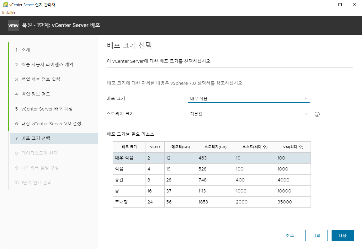 10. 배포 크기 선택 단계로 저의 사양에 맞게 매우 작음을 선택 후 넘어갔습니다.