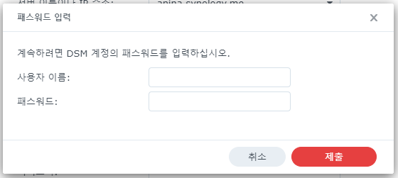 4. 대상 NAS DSM 계정 및 패스워드를 입력 후 제출합니다.