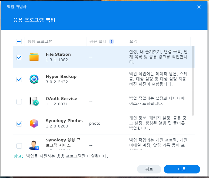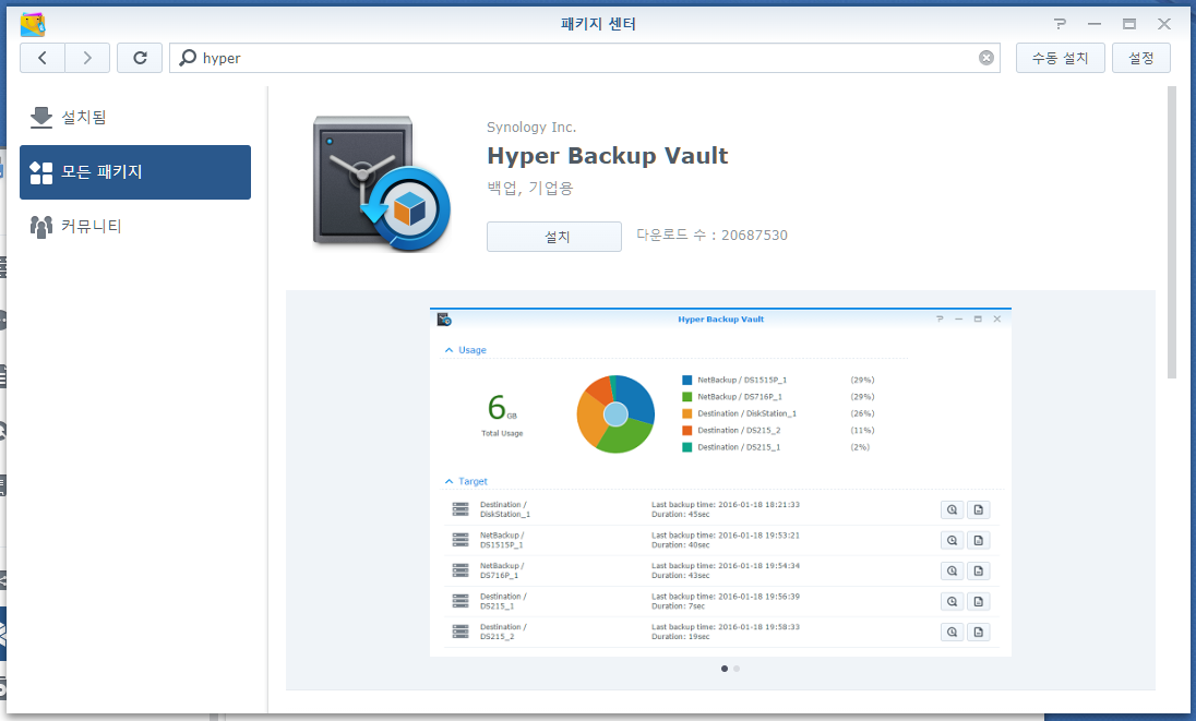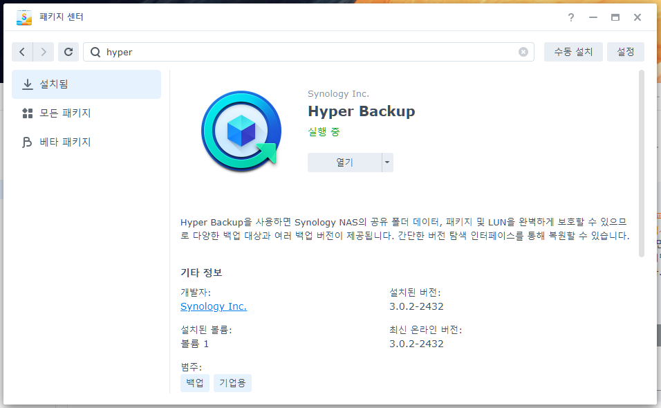 1. 패키지 센터에서 Hyper Backup 찾아 설치 및 실행합니다.