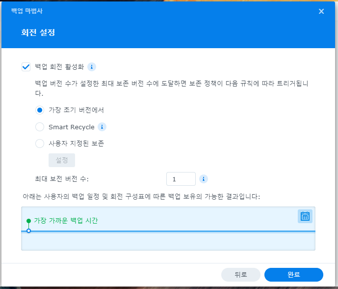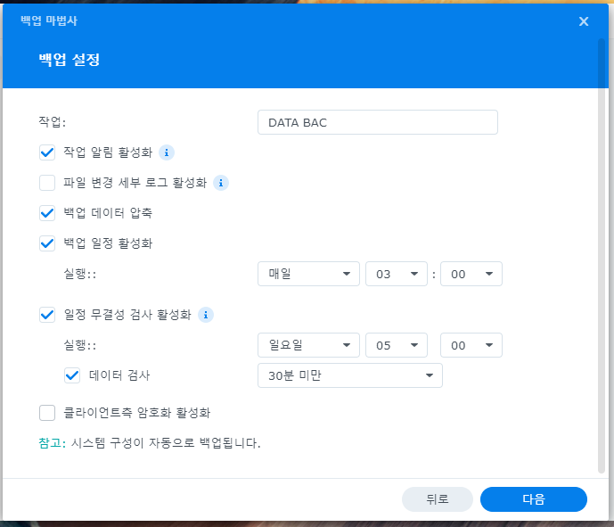 저의 경우 백업은 매일 오전 3시, 무결성 검사는 매주 일요일 오전 5시에 진행하게 설정했습니다.