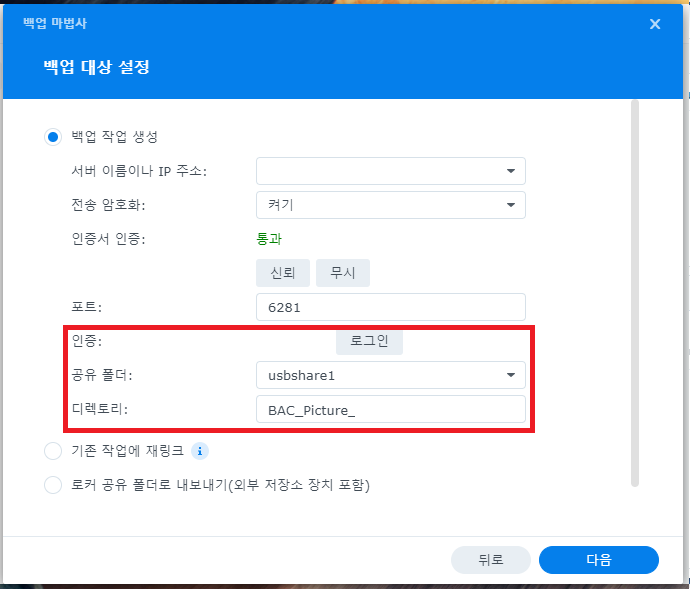 3. 백업 대상 NAS에 대한 정보를 입력하여 설정을 해줍니다.