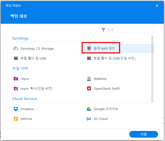 2. 실행하게 되면 백업 마법사가 나오는데 원격 NAS 장치를 선택 후 다음으로 넘어가 줍니다.