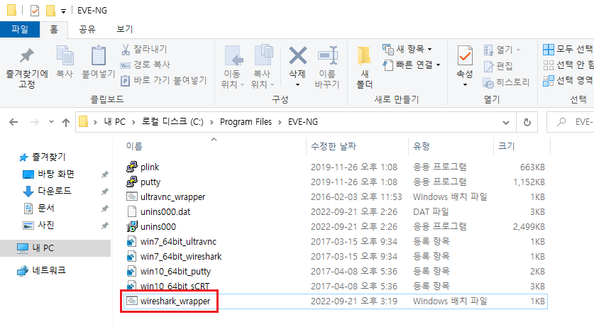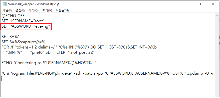 먼저 첫 번째 방법은 EVE-NG가 설치된 곳으로 이동하여 wireshark_wrapper 파일을 메모장으로 열어줍니다.