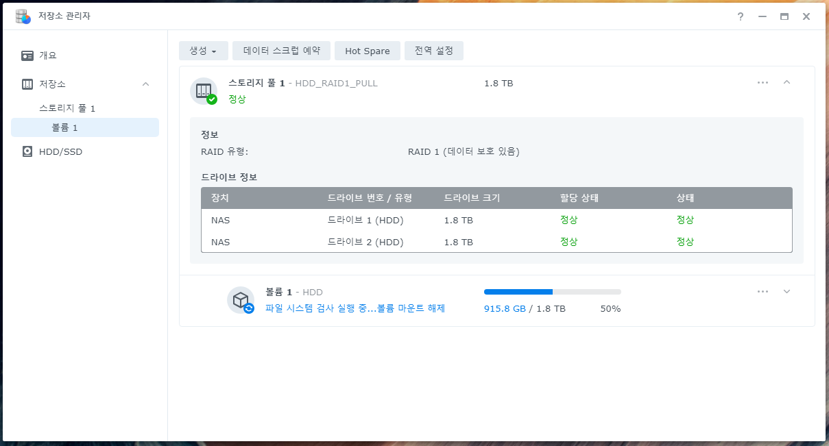 오늘은 NAS를 사용하는 중에 드라이브에서 비정상 정전이 발생하였다고 알람이 왔습니다.