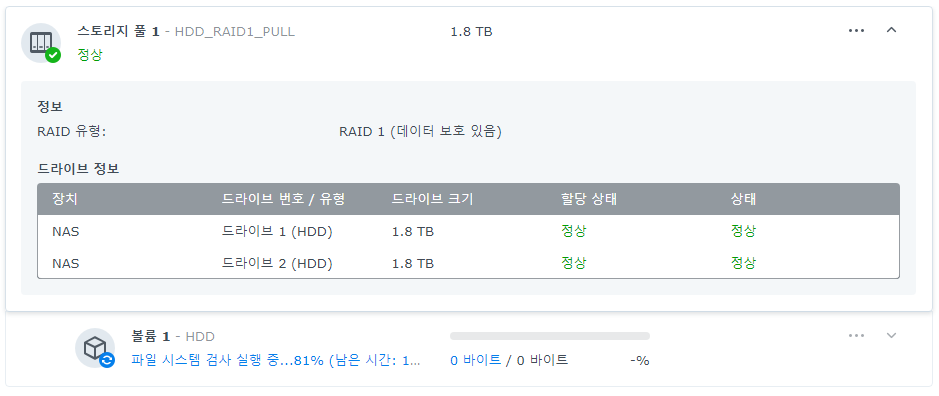 용량 따라 진행속도는 다르겠지만, 2TB RAID 1 환경에서는 약 2분 미만으로 완료되었습니다.