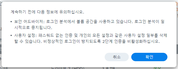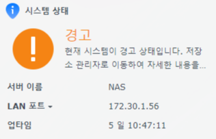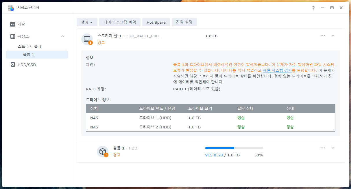 오늘은 NAS를 사용하는 중에 드라이브에서 비정상 정전이 발생하였다고 알람이 왔습니다.