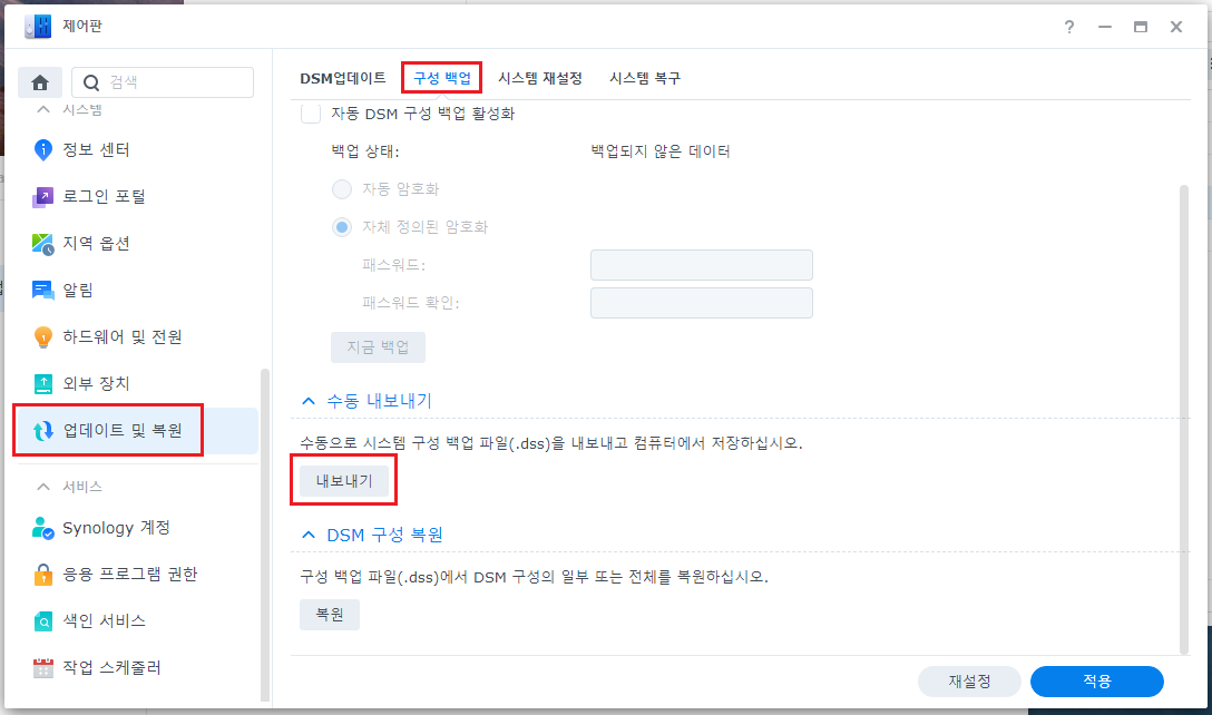 파일 시스템 검사에 앞서 혹시 모르니 구성 백업을 진행했습니다.