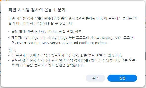 파일 시스템 검사를 눌러 시작하게 되면 주의 문구를 보여주게 됩니다.