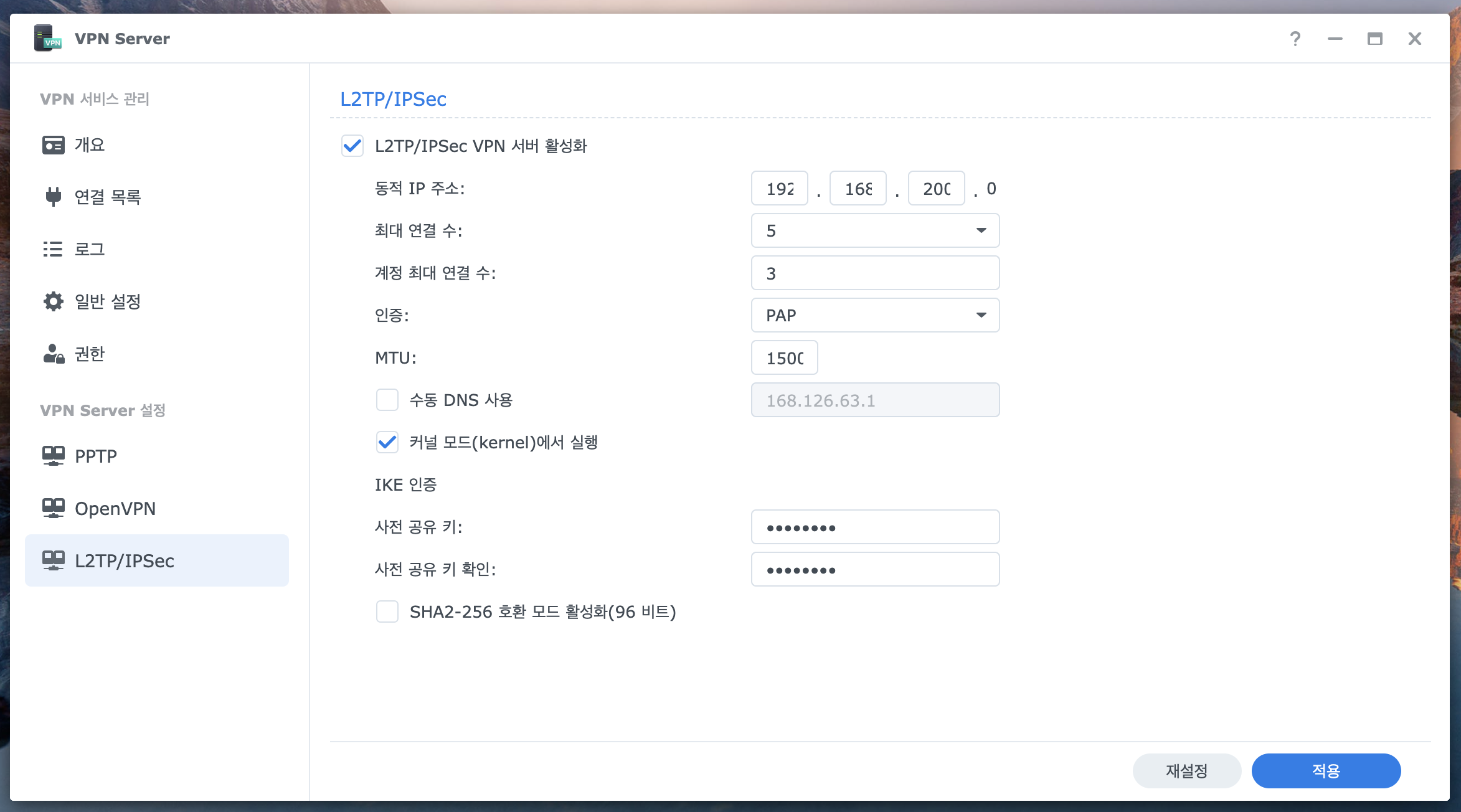 3. 왼쪽 카테고리에 L2TP/IPSec 메뉴에 들어가서 위 사진처럼 설정해줍니다.