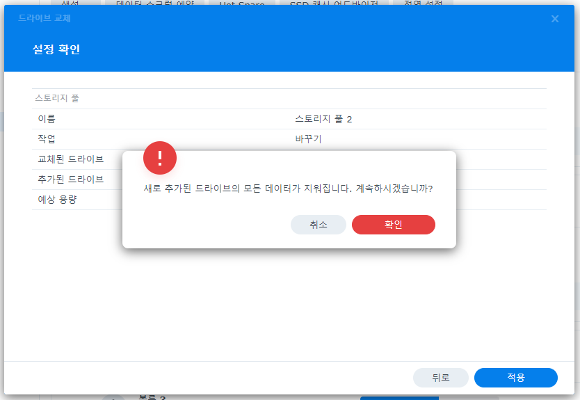 5. 새로 추가한 디스크에 데이터가 지워지는데, 확인을 누르면 교체가 시작됩니다.