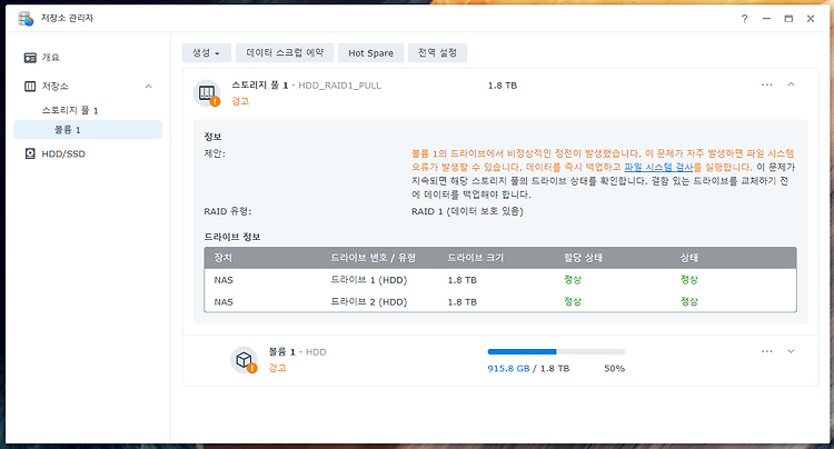 안녕하세요 ~ 현재 하드디스크 스토리지 풀은 4TB 4개로 RAID 5 약 10.5TB의 용량을 가지고 있습니다. 하지만 2년째 사용하고 있는 지금 약 80% 이상 사용하고 있어, 디스크 증설이 필요하게 되었습니다. 그래서 이번에 진행할 작업은 드라이브 교체 기능을 이용하여, 4TB*4 -> 8TB*4개로 변경해보려고 합니다. 드라이브 교체 방법은 아래 글을 참고해 주세요. https://blog.1nfra.kr/491 [Synology] DSM 7 드라이브 교체 안녕하세요 ~ 오늘은 Synology에서 드라이브 교체 기능을 사용해보려고 합니다. 기존 DSM 6에서는 멀쩡한 디스크를 교체하려면, RAID를 깨고 디스크를 교체 후 수리를 했습니다. 하지만 이번 DSM 7에 blog.1nfra.kr 이전에 ..