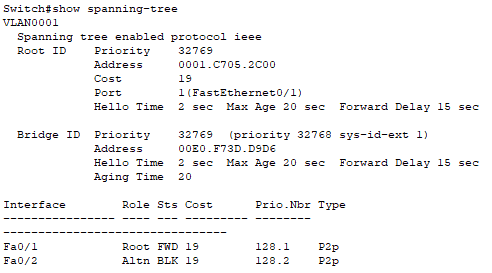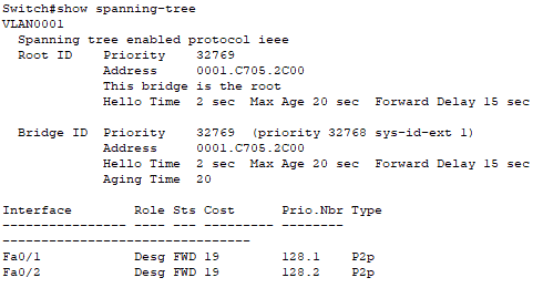 show spanning-tree 명령어로 Bridge값과 MAC주소를 확인할 수 있다.