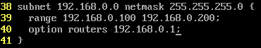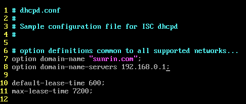 "vi /etc/dhcp/dhcpd.conf" 명령어로 dhcpd.conf 파일의 #line7,8번째 줄 수정