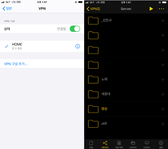 위에 사진은 외부에서 VPN를 연결했을 때 화면이다. IP도 잘 받아오는 것을 확인할 수 있다.