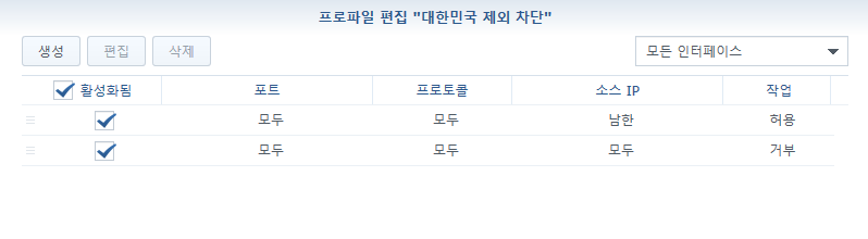 프로파일에서 대한민국 제외 차단을 선택해주고 규칙 편집을 눌러줍니다.