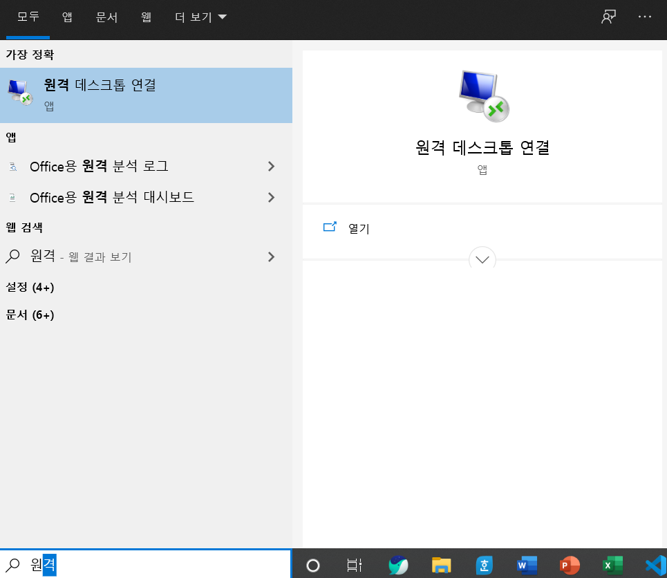 검색에서 원격을 검색하면 원격 데스크톱 연결이 나옵니다.