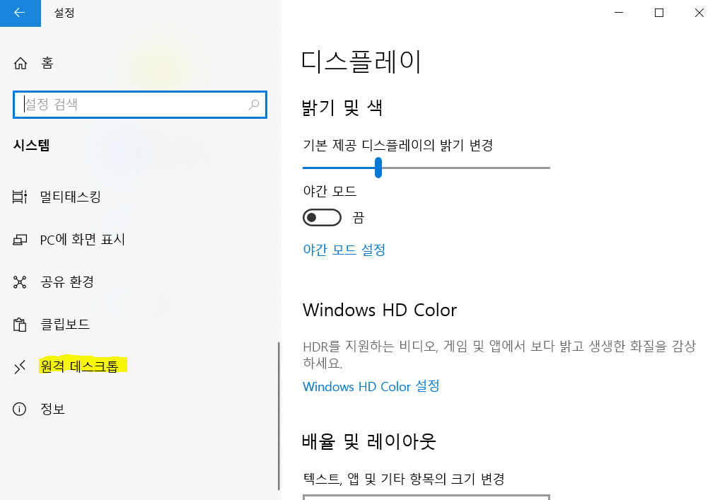 먼저 설정 -> 시스템 -> 원격 데스크톱으로 들어가 주세요.