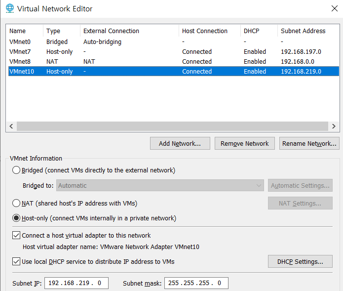 그럼 이렇게 기본으로 VMnet10이 생성되고 Host-only 모드로 된 것을 볼 수 있습니다.