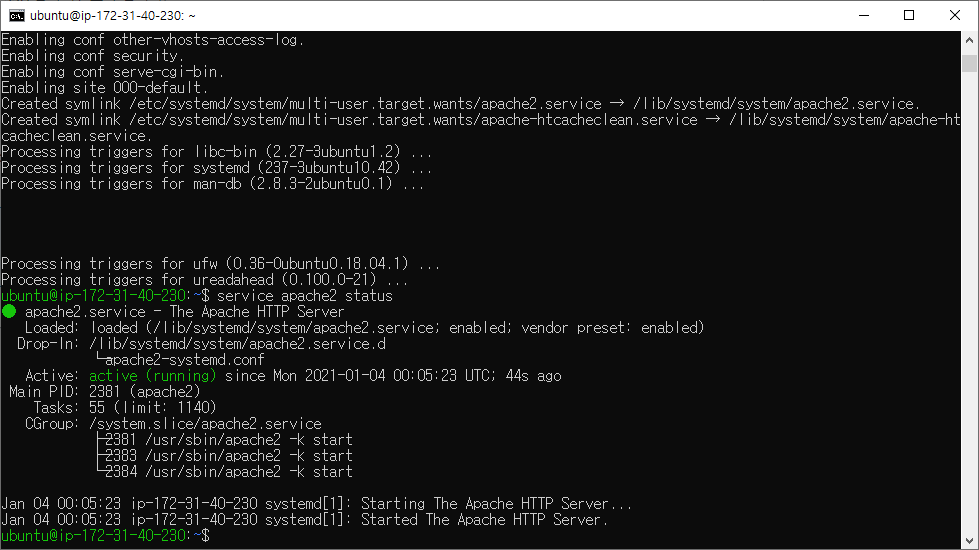 설치가 완료되면 service apache2 status 명령어를 사용하여 서비스 상태 확인을 해줍니다.